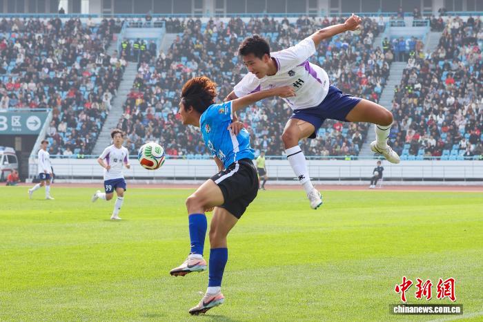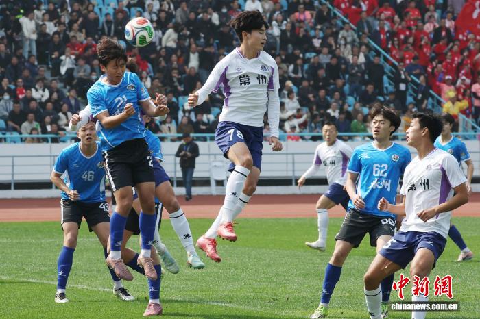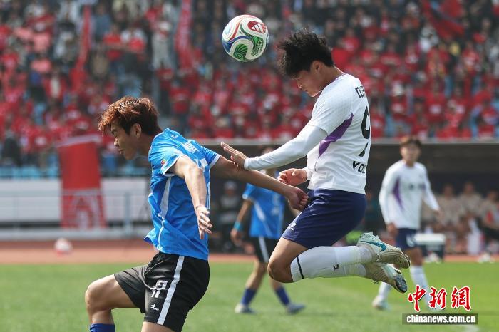 3月25日,江苏常州取湖北永州脚球交谊交换赛正在常州奥体重心运动场举办,终究,常州队1比0打败永州队。角逐进程中,两边球员拼劲全部,不雅赛球迷热中飞腾。图为常州队球员(黑衣)取永州队球员(蓝衣)正在角逐中拼抢。中新社记者 泱波 摄